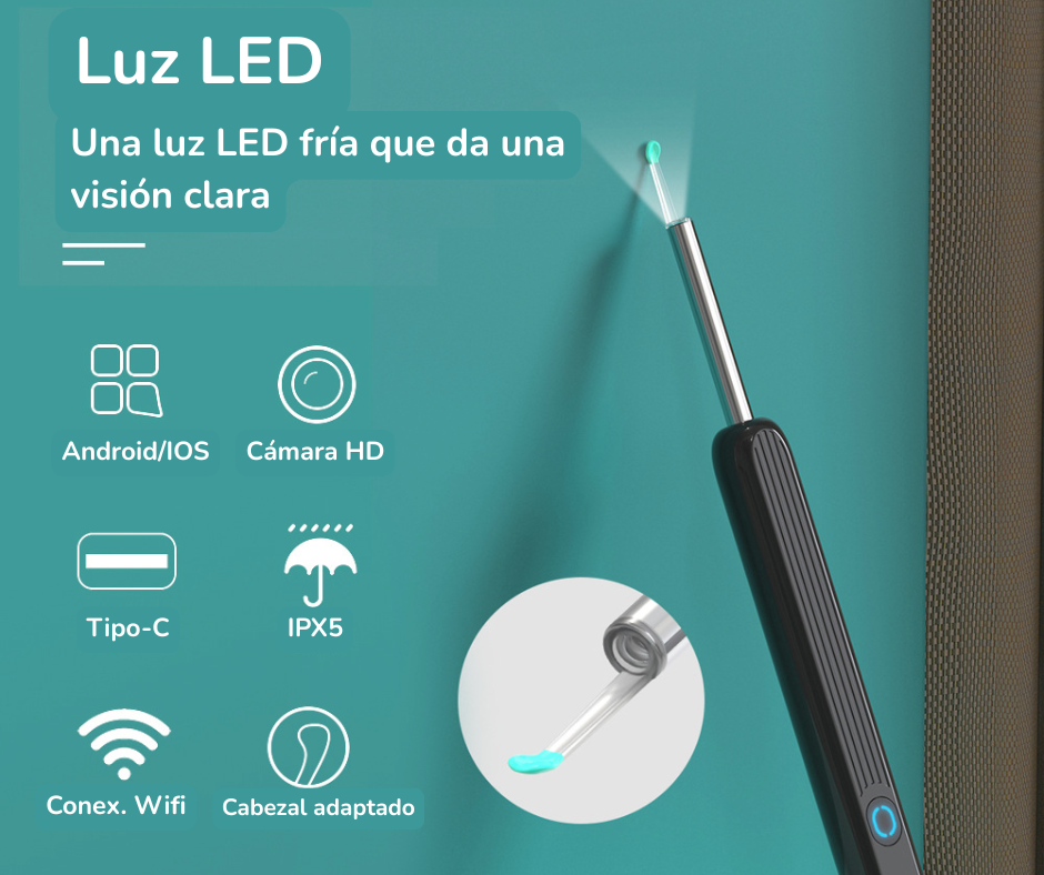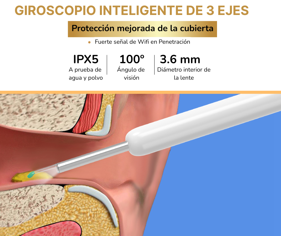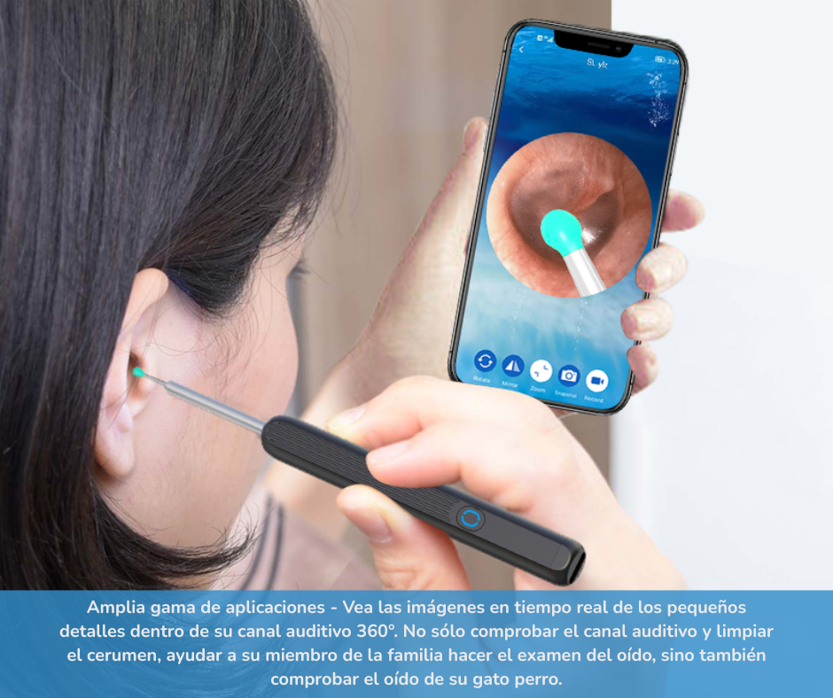 El cabezal giratorio de 360° permite ajustar el ángulo de visión con total libertad, facilitando la limpieza en áreas difíciles y mejorando la visibilidad dentro del canal auditivo.